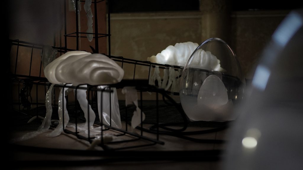 Puis viens la nurserie, ce sont des éléments figés, rétroéclairés qui jouent des variations de la lumière entre le verre soufflé, la fibre et les tissus. Chez les termites, plusieurs galeries et étages au sein de leurs cités sont consacrés aux œufs, aux larves et aux nymphes. J’ai travaillé sur cellules ovales opaques et translucides en verre soufflé, en développant des formes ayant un intérêt plastique et soulignant cette dimension de prolifération et de fécondation de masse.